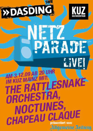 Schönen guten Tag mein Damen und Herren, am Donnerstag betreten die Noctunes dieses Jahr zum 155 mal eine Bühne. Am 03.12. ab 20 Uhr findet im KUZ Mainz die DasDing Netzparde Vol.6 statt, diesmal mit THE RATTLESNAKE ORCHESTRA, CHAPEAU CLAQUE und, nicht zu vergessen, den NOCTUNES. Das ganze beginnt um 20:00 Uhr und der Eintritt beträgt 5,00 Euro ![]() See you there! |